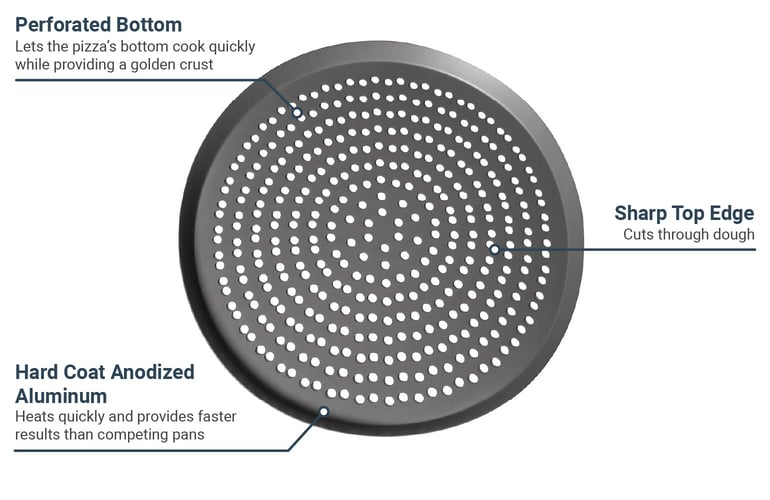 Khay pizza American Metalcraft CAR16SPHC được làm từ nhôm anodized cứng, làm nóng nhanh và đều. Có các lỗ 1 cm ở đáy khay để nướng đáy pizza nhanh chóng đồng thời tạo vỏ bánh màu nâu. Độ ẩm có thể thoát qua các lỗ thủng để đảm bảo pizza hoàn thiện luôn tươi ngon. Khay pizza có đường kính ngoài 40.6 cm, đường kính trong 38.1 cm và độ sâu 2.7 cm.