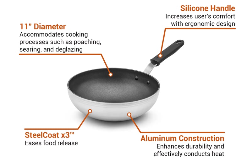 Cho việc sử dụng thường xuyên trong bếp nhà hàng, chảo xào Vollrath 682311 được làm từ nhôm dẫn nhiệt tốt có khả năng chịu nhiệt độ 450 độ Fahrenheit liên tục và 600 độ Fahrenheit trong thời gian ngắn. Lớp hoàn thiện SteelCoat x3™ kéo dài tuổi thọ của dụng cụ nấu ăn với khả năng chống mài mòn và thúc đẩy việc nhả thức ăn mượt mà. Sản phẩm có tay cầm silicone tán đinh giảm truyền nhiệt đến lòng bàn tay của nhân viên, và có đường kính 27.9 cm.